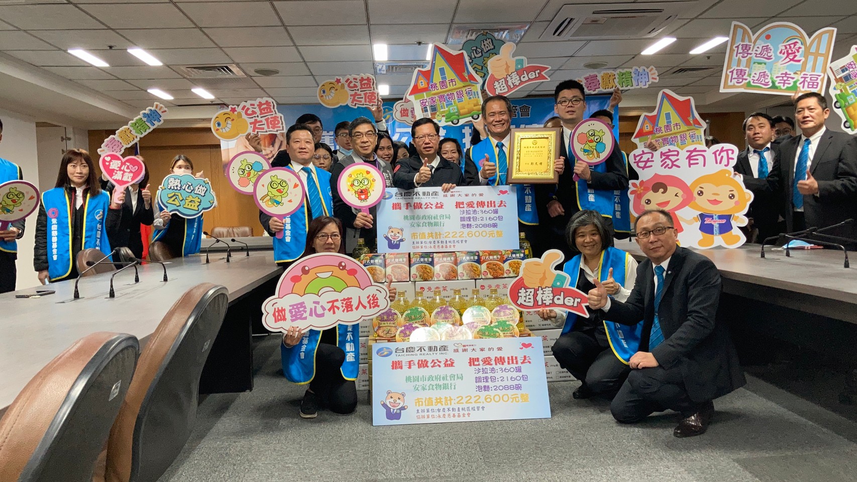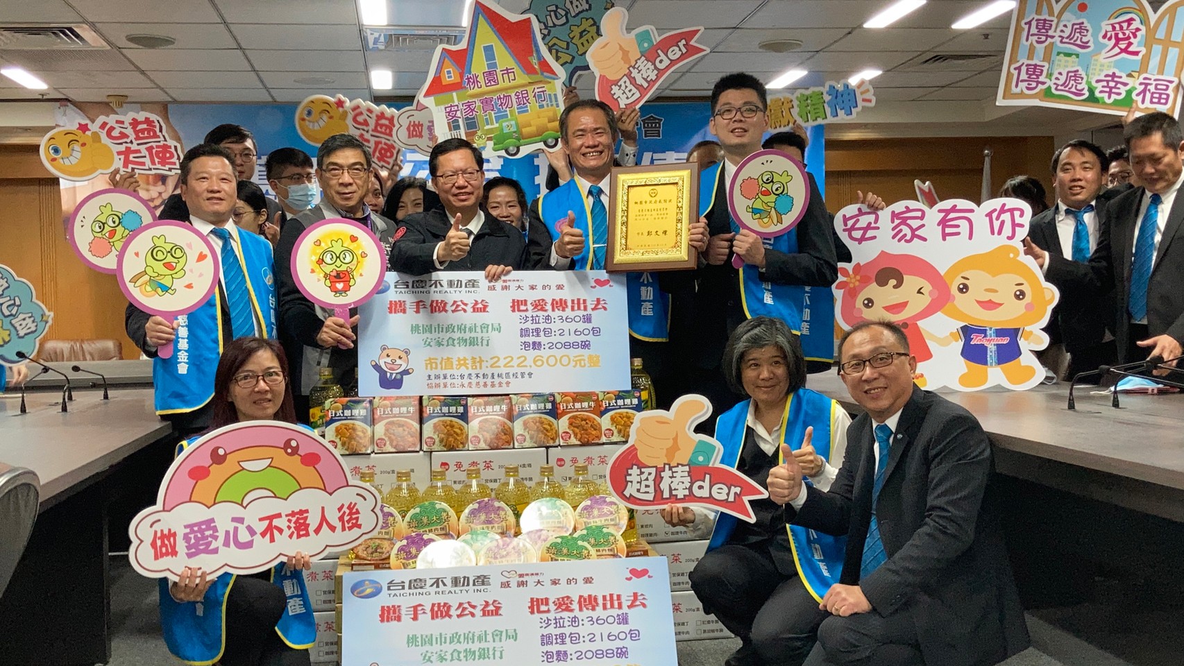 歲末年終之際,台慶不動產桃園地區14家加盟店聯合捐贈民生食品物資,包含346箱泡麵、90箱調理包及60箱油(市值超過30萬元)予本市安家實物銀行,於110年12月28日下午3時30分於桃園市政府1201會議室舉辦捐贈儀式,由鄭文燦市長贈予感謝牌表彰捐贈者的善舉。