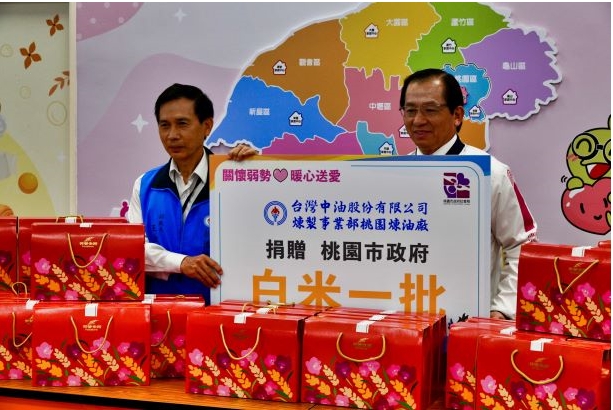 台灣中油股份有限公司煉製事業部桃園煉油廠 (以下簡稱中油桃園煉油廠)捐贈400盒白米禮盒關懷本市弱勢家戶,112年3月16日上午9時00分於桃園市政府社會局中路家庭服務中心舉行捐贈儀式,並致贈感謝牌表彰善舉。