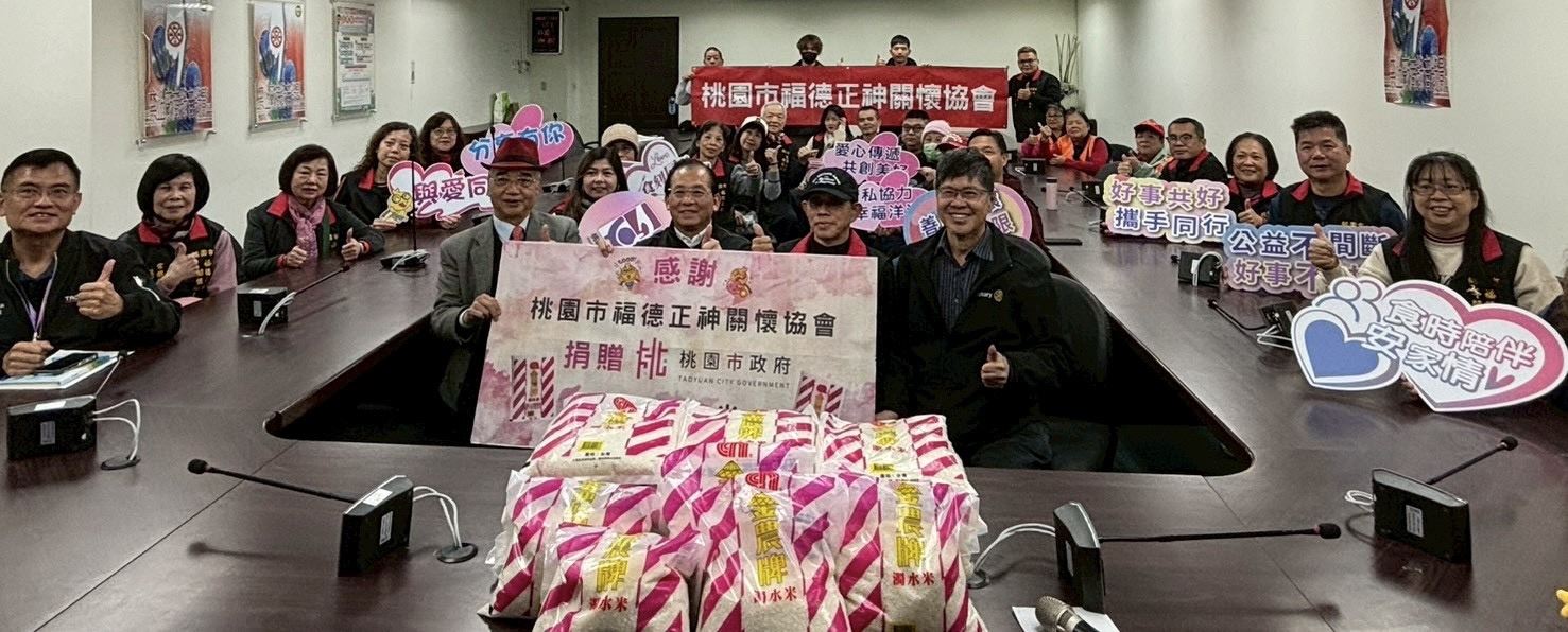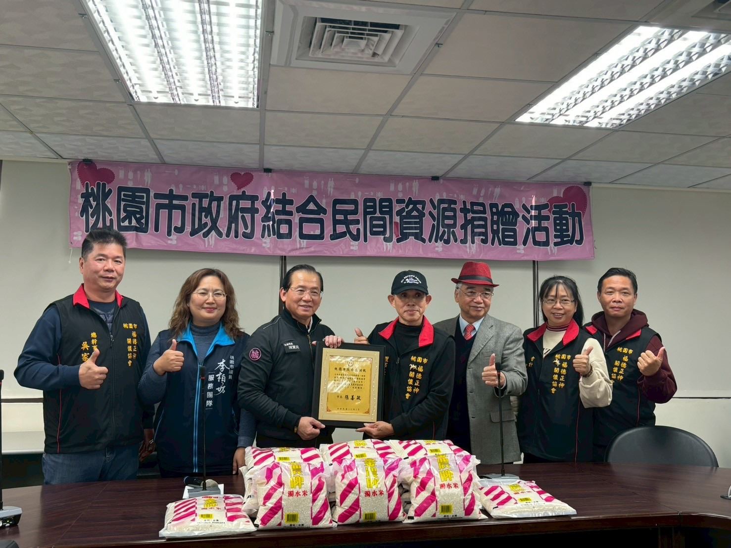 桃園市福德正神關懷協會捐贈1萬斤白米予本市弱勢家戶,115年1月9日下午於桃園市政府8樓802會議室舉辦捐贈儀式,並由社會局陳寶民局長代表致贈感謝牌表彰善舉。